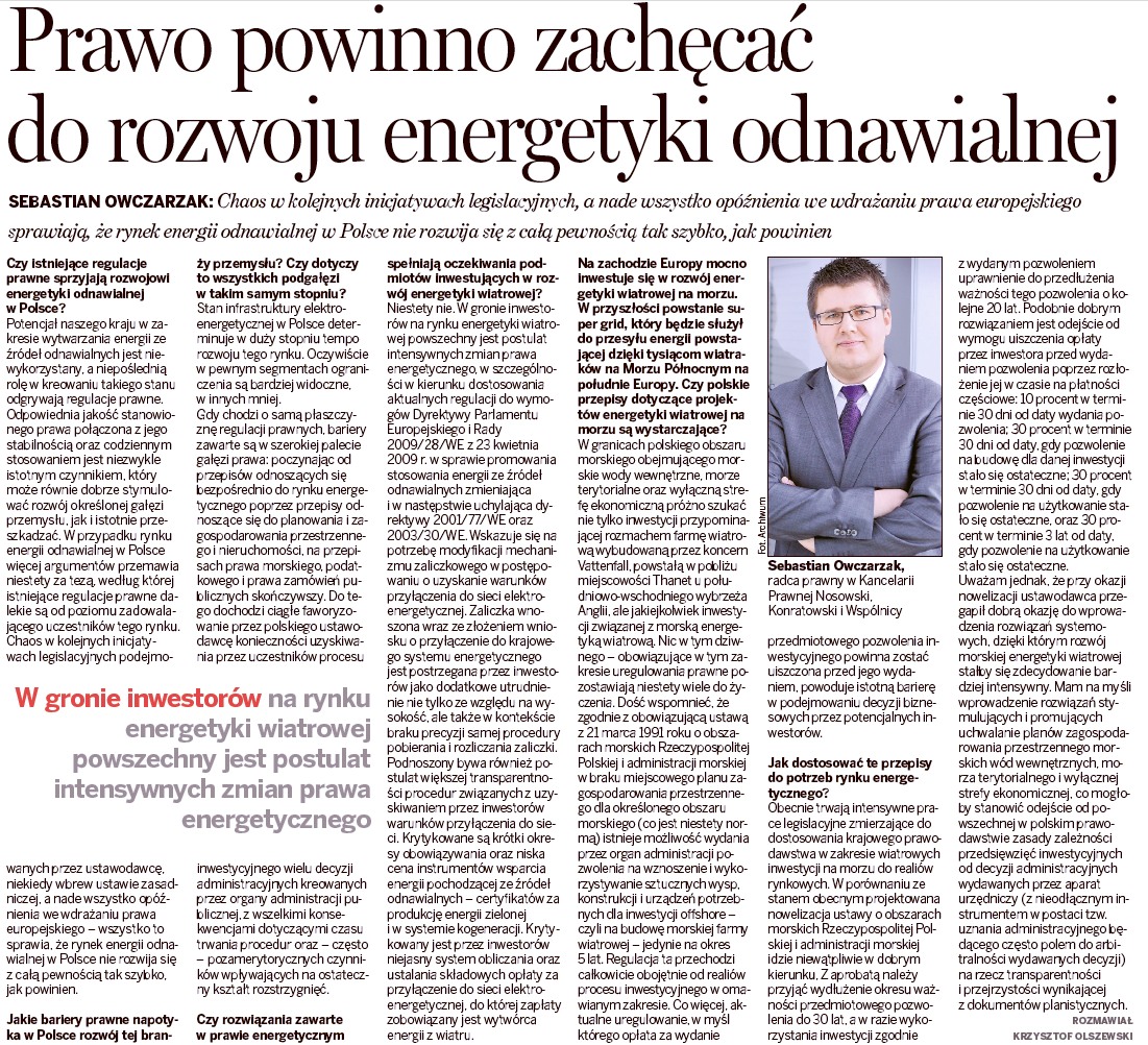 W ubiegłym tygodniu natomiast, w „Dzienniku Gazeta Prawna”, w dodatku „Biznes i energia” ukazał się wywiad z Sebastianem Owczarzakiem, w którym rozważa on rolę istniejących uregulowań prawnych w rozwoju rynku energetycznego w Polsce.
